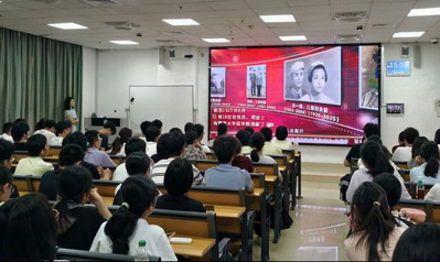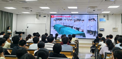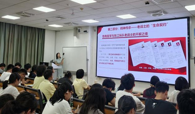 课堂伊始,全体师生共同观看九三阅兵视频片段,以及学院党委精心制作、荣获“第一届广东党史微视频活动”精品奖的作品《从烽火战场到医学课堂——东江纵队老战士用生命余温点亮精神灯塔》。李秀玉紧扣“抗战精神如何在新时代焕发新的生命力”这一主题,通过“检阅车1945—2025”的时空对话,将东江纵队浴火奋战的烽火岁月、老战士“生命契约”的红色基因、暨医人“无语良师”的大爱故事贯通讲述,让这堂课既富思想深度,又充满人文温度。