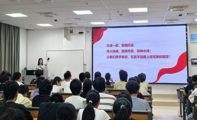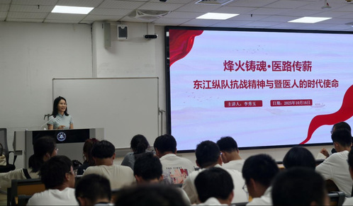 10月16日下午,基础医学与公共卫生学院党委书记李秀玉以“烽火铸魂·医路传薪——东江纵队抗战精神与暨医人的时代使命”为主题,为临床医学专业2025级内招本科新生讲授思政第一课。